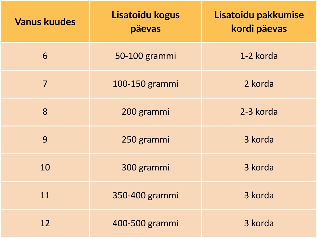 Lisatoiduga alustamise aeg on individuaalne, erandjuhul võib algust teha ka pärast 4. elukuud.